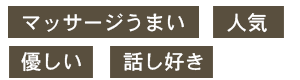 お仕事で悩みや疲労はありませんか?すぐに取り除くのがいいと思います。マッサージは人の温かい手の癒しをじっくり感じられるのでやる気がわいたり、うとうとして一度頭がリセットされるので、すっきりした気分でお帰りいただけます。 明るくで若いエネルギッシュな女の子に囲まれてしばし喧騒を離れてみませんか?